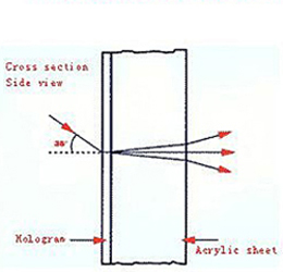 全息屏幕是將一層全息薄 膜壓在半透明的亞克力的薄板上。這全息薄膜只對從35°背投的光線(xiàn)有作用。其它光線(xiàn)如太陽(yáng)光和其它周?chē)饩(xiàn)被忽略。